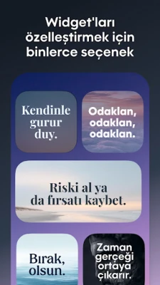 Ana ekranınıza ekleyebileceğiniz özel widget'ı sayesinde, telefonunuzu her açtığınızda yenilenen, ilham verici bir alıntıyla karşılaşın. Motivation'ın kullanıcı dostu arayüzü ile widget'larınızın görünümünü dilediğinizce kişiselleştirin; yazı tiplerinden renk paletlerine kadar her detayı kendi zevkinize göre ayarlayın. Uygulama içinde, yüzlerce ilham verici alıntıyı keşfedebilir, favorilerinizi kaydedebilir ve hatta arkadaşlarınıza paylaşarak pozitifliği yayabilirsiniz. Alıntıların tasarımını değiştirerek sosyal medyada etkileyici görseller oluşturabilir veya kendi duvar kağıdınız olarak kullanabilirsiniz. Spor motivasyonundan aşk temalı sözlere, iş hayatındaki başarı ipuçlarından özsaygıyı artırmaya yönelik mesajlara kadar geniş bir yelpazede binlerce içeriği parmaklarınızın ucunda bulun.